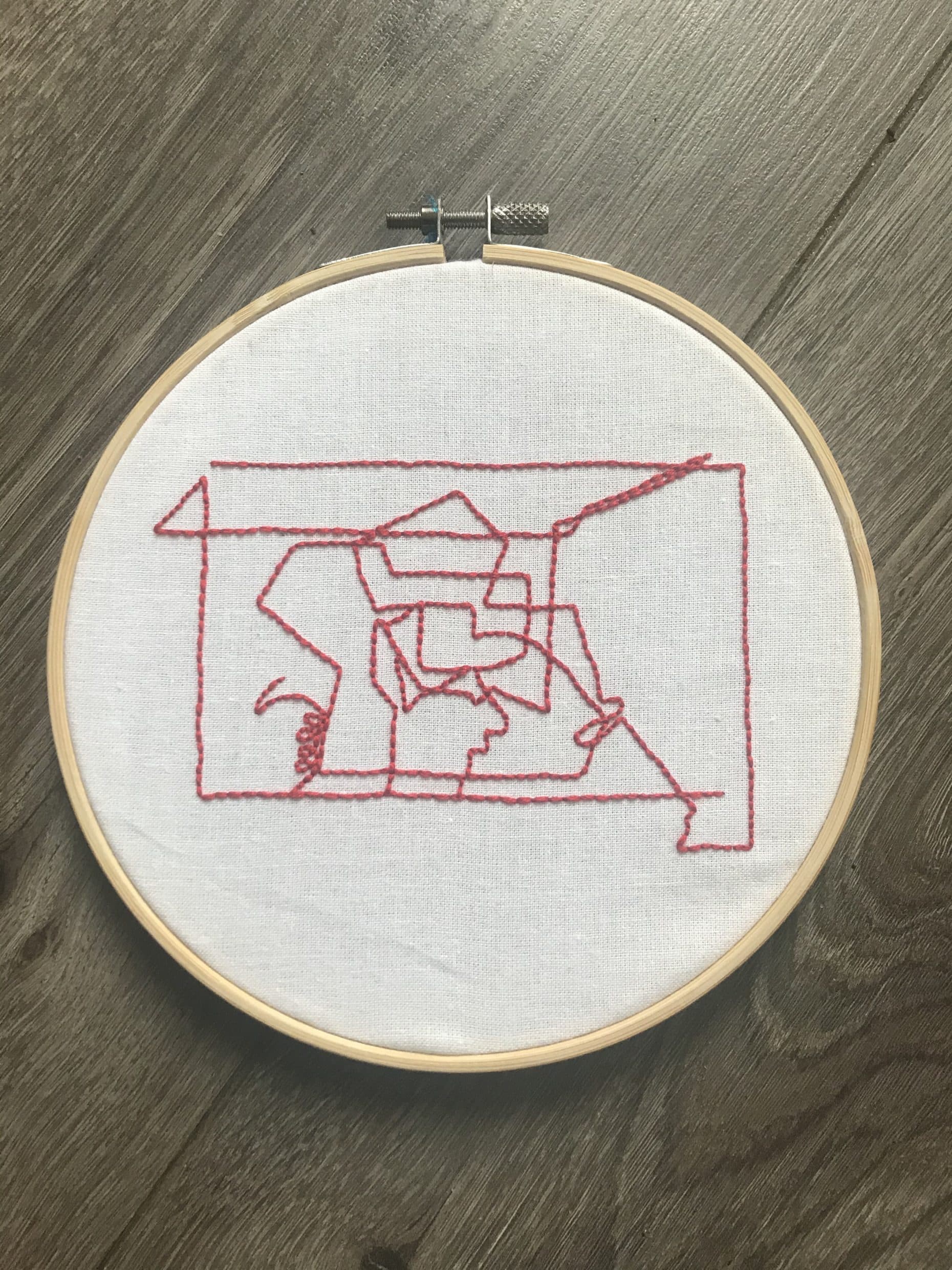 Each embroidery began as an original drawing and is hand stitched. This continuous line drawing was inspired and sketched on site at ‘Command Lines’ by the artist Candida Powell-Williams in Void Gallery, Northern Ireland.
